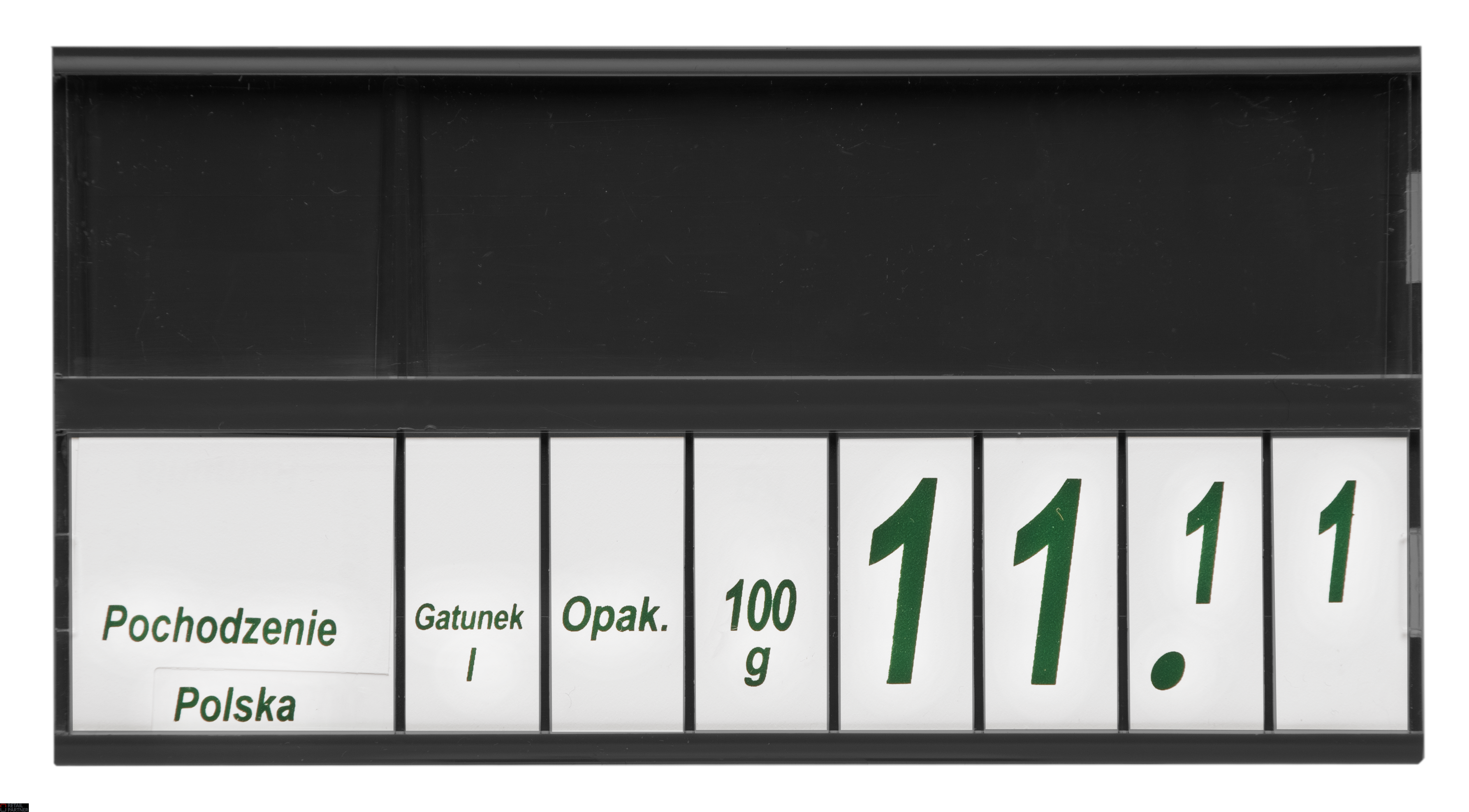Jedna służy do umieszczenia opisu towaru, druga podzielona jest na 6 przegródek na cyfry tworzące cenę.