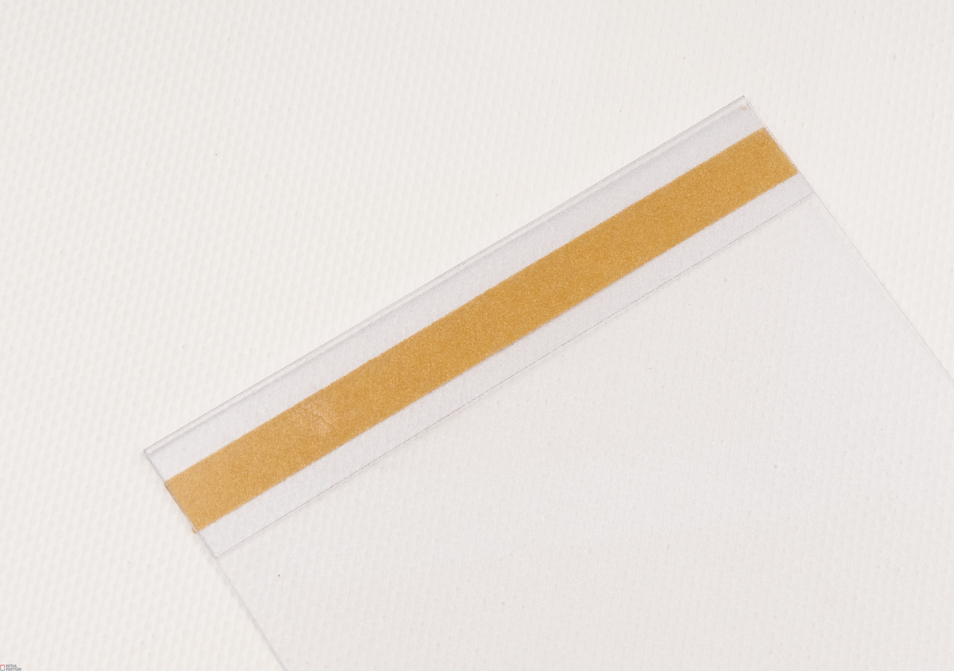 Na tylnych zagięciach (lamówkach) znajduje się taśma samoprzylepna umożliwiającą przyklejenie poszetki informacyjnej do półki, regału ściany lub innego podłoża.